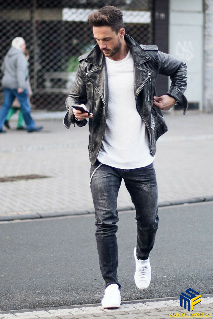 Áo khoác da truyền thống với thiết kế đơn giản mix cùng quần Jenas tối màu, giày thể thao đơn giản như thế này cũng giúp đấng mày râu thể hiện được sức mạnh của mình. Đây sẽ là set đồ lý tưởng cho mùa đông sắp tới của bạn.