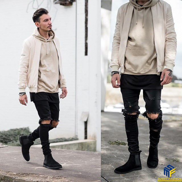 Nếu chọn quần và áo đều có tông màu tối như đen, xám, nâu thì sẽ gợi cảm giác hơi bụi bặm nhưng rất ấm áp. Chọn những bộ có màu sắc tương phản thì trông thật nổi bật giữa đám đông. Chiếc áo Hoodie cá tính sẽ hợp với quần jean rách, jean cách điệu hơn là các mẫu jean cơ bản. Lựa chọn phong cách này rất thích hợp cho việc dạo phố cùng bạn bè.